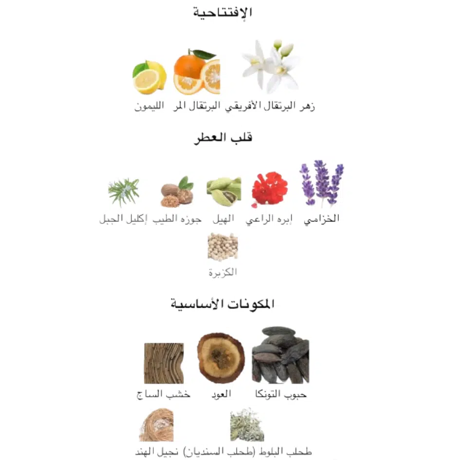 - توليفة عطرية مكثفة: مزيج متناغم يجمع بين انتعاش الحمضيات ودفء التوابل وعمق الأخشاب، مما يمنحك هالة من الفخامة في كل خطوة.